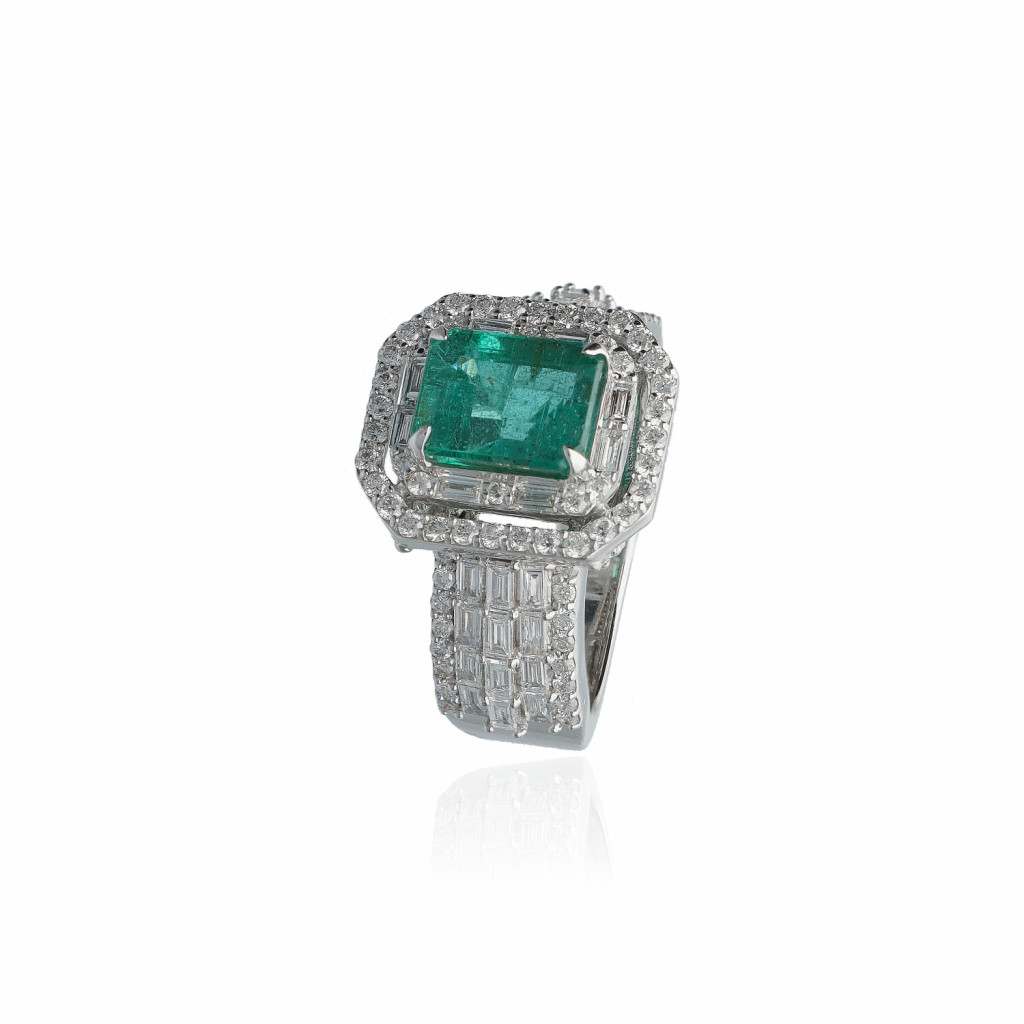 Moni's Diamond Fehérarany Smaragd Gyűrű összesen 1.63 ct gyémánttal. Az ékszerben Vs tisztaságú, G színű, csiszolású természetes gyémánt és Smaragd drágakő ragyog. A gyémántékszer mellé minőségi tanúsítványt adunk.