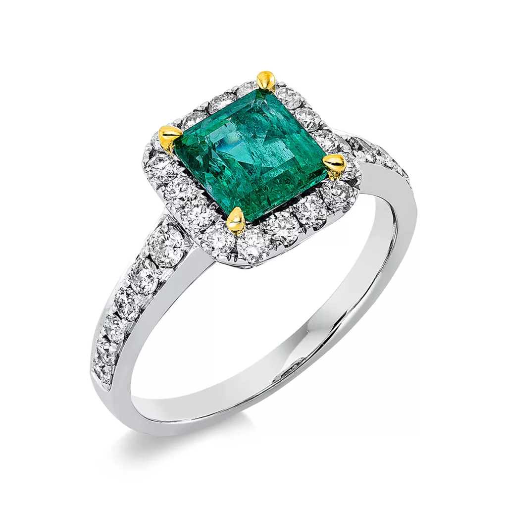 gyürü, fehér / sárga arany 18 kt, 28 gyémánt 0,68 ct, G-vs1, 1 smaragd 1,38 ct zöld