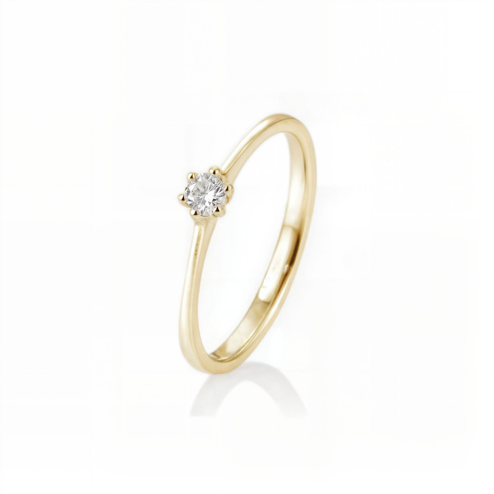 Moni's Diamond Sárga arany Gyémánt Eljegyzési gyűrű összesen 0.1 ct gyémánttal. Az ékszerben SI tisztaságú, H színű, Briliáns csiszolású természetes gyémánt ragyog. A gyémántékszer mellé minőségi tanúsítványt adunk.