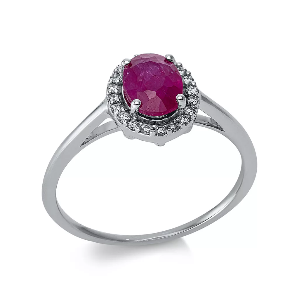 Moni’s Diamond Whitegold Ruby Ring, presenting a total of 0.1 ct Briliant, SI clarity, G color diamonds and 0,97 ct Ruby. The piece comes with a certificate of authenticity.