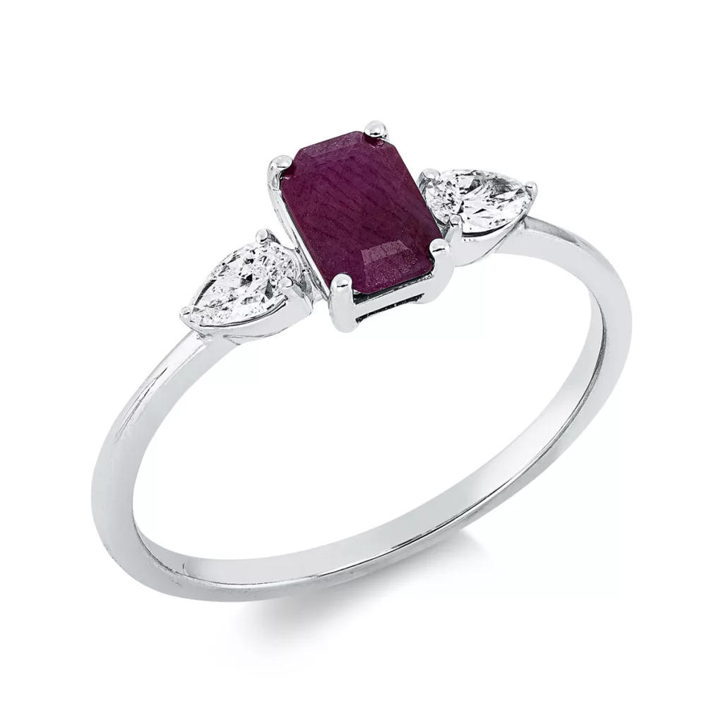 Moni’s Diamond Fehérarany Rubin Gyűrű összesen 0.2 ct gyémánttal. Az ékszerben SI tisztaságú, G színű, Pear shape csiszolású természetes Gyémánt és 0,75 ct Rubin drágakő ragyog. A gyémántékszer mellé minőségi tanúsítványt adunk.