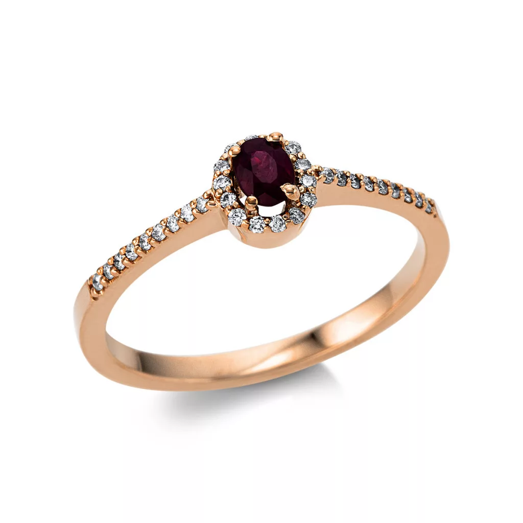 Moni’s Diamond Redgold Ruby Ring, presenting a total of 0.12 ct Briliant, SI clarity, G color diamonds and 0,21 ct Ruby. The piece comes with a certificate of authenticity.