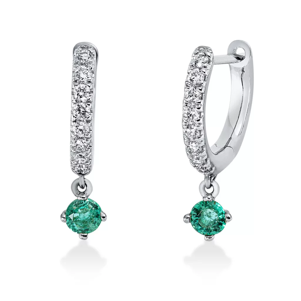 Moni’s Diamond Whitegold Emerald Earrings, presenting a total of 0.15 ct Briliant, SI clarity, G color diamonds and 0,27 ct Emerald. The piece comes with a certificate of authenticity.