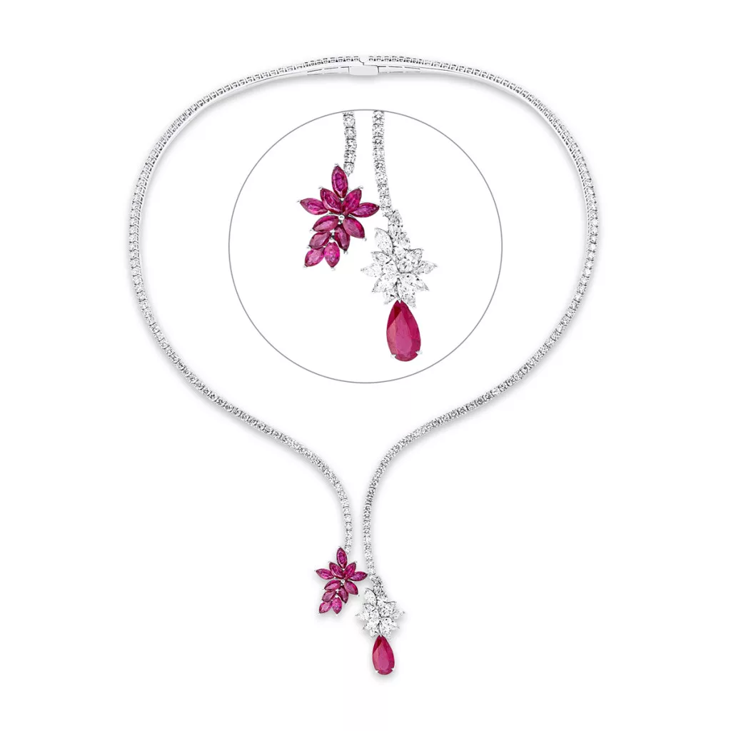 nyaklánc, fehér arany 18 kt, 11 marquise 1,76 ct, F-vs1, 198 gyémánt 11,10 ct, G-vs1, 1 rubin 2,35 ct piros, 11 rubin 3,12 ct piros, h:45,7 cm