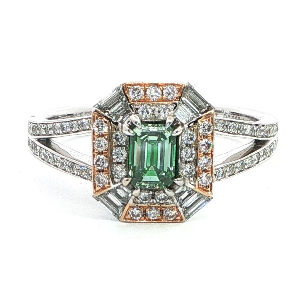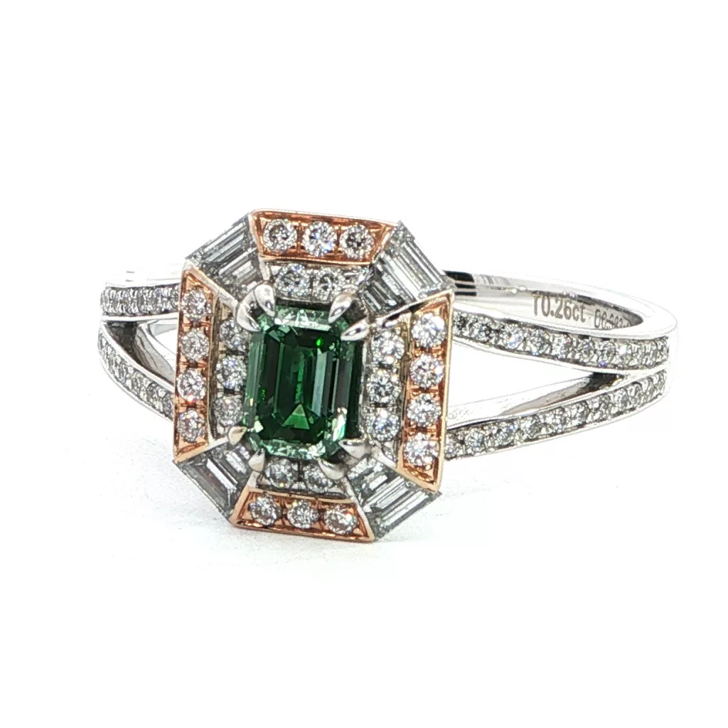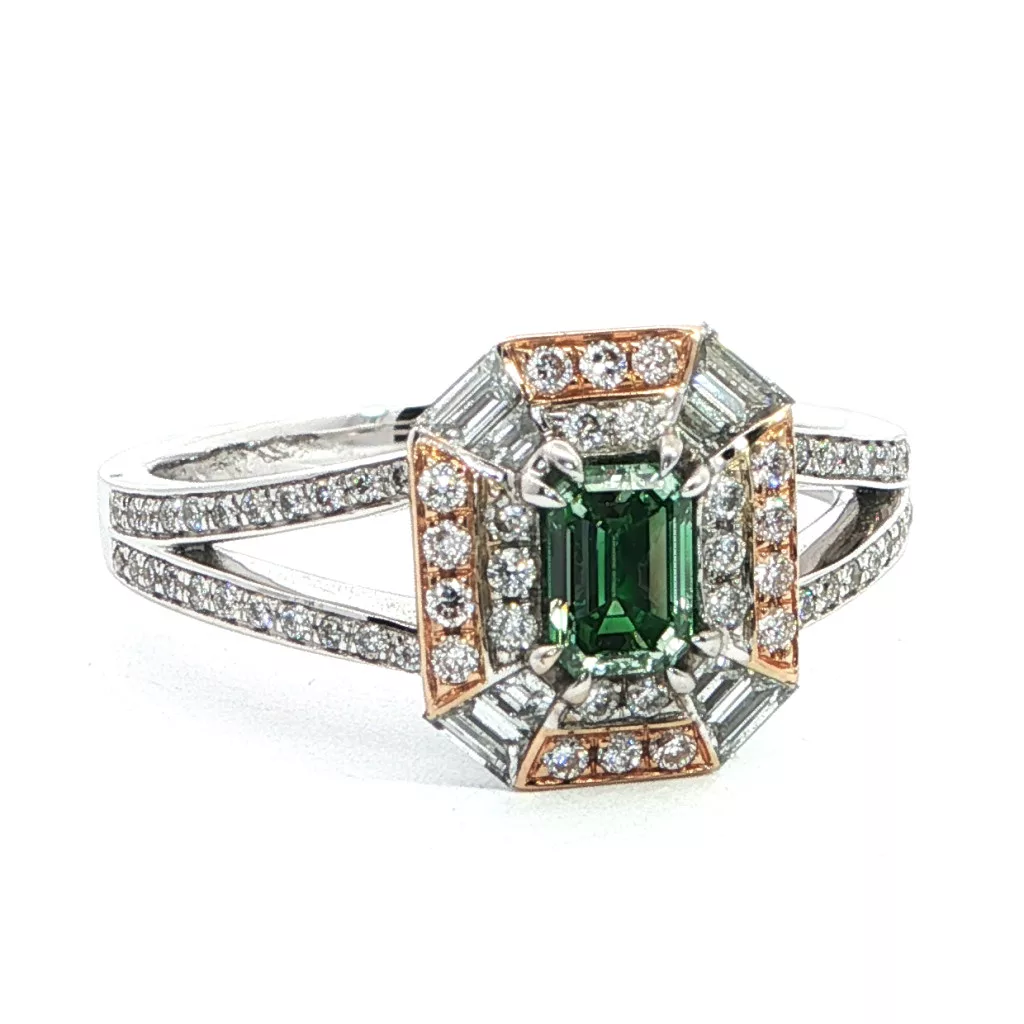 Moni's Diamond White Gold Peridot Ring, presenting a total of 0.92 ct, Vs clarity, G color diamonds and 0.40 ct Peridot. The piece comes with a certificate of authenticity.