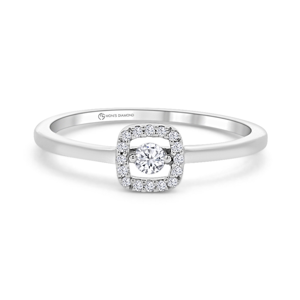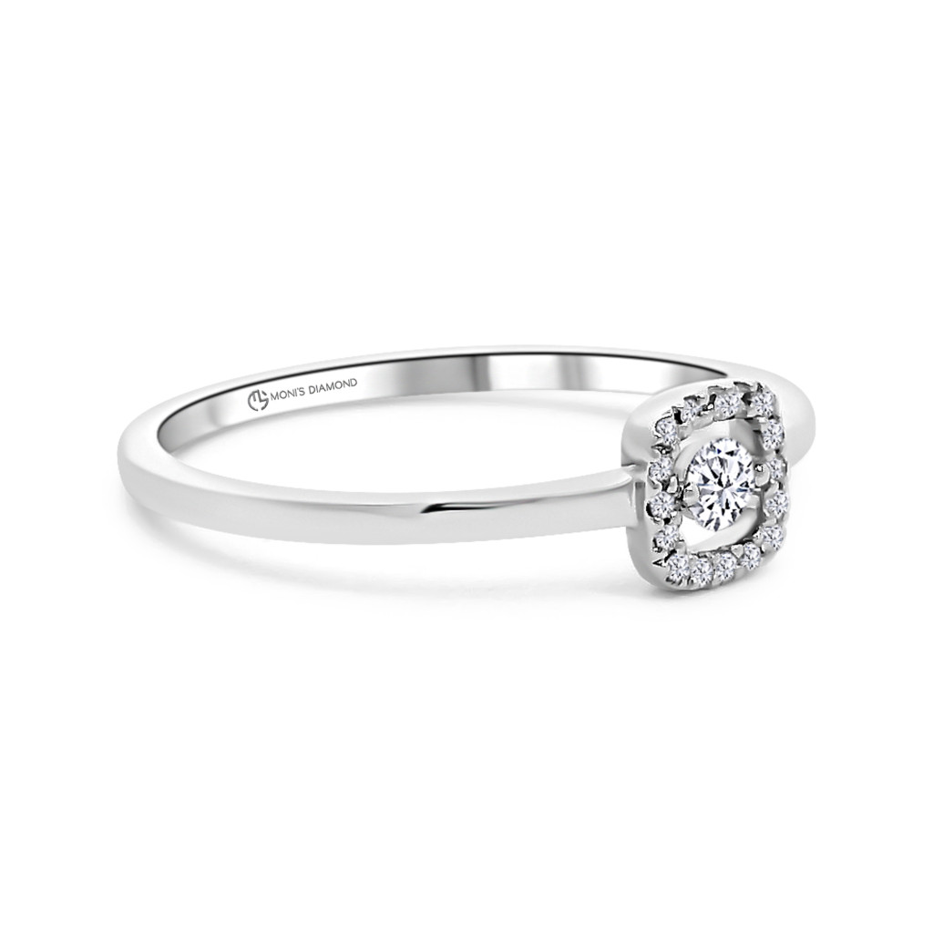 Egy apró részlet is lehet tökéletesen emlékezetes – ezt bizonyítja ez a 0.10 karát összsúlyú fehérarany gyémánt eljegyzési gyűrű. Középpontjában egy briliáns csiszolású természetes gyémánt ragyog, amelyet különleges, négyzet alakú halo foglalat vesz körül. A finom, visszafogott formavilág és a precízen megmunkált fehérarany elegáns, mégis modern hatást kelt. Minden Moni’s Diamond gyémántékszer hivatalos tanúsítvánnyal érkezik, igazolva a drágakövek természetes eredetét és kiváló minőségét.