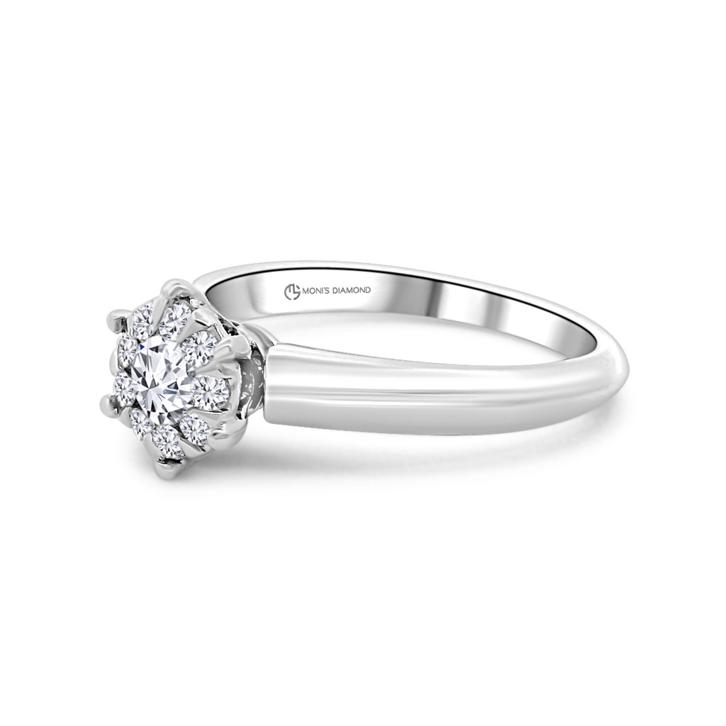 gyémánt eljegyzési gyűrűt. Középpontjában egy briliáns csiszolású természetes gyémánt tündököl, amelyet kilenc kisebb, szintén briliáns csiszolású gyémánt ölel körbe, finom fénykoszorút alkotva. A precízen kidolgozott fehérarany foglalat elegáns keretet biztosít, amely kiemeli a drágakövek ragyogását. Az eljegyzési gyűrű hivatalos tanúsítvánnyal érkezik, igazolva a drágakövek természetes eredetét és minőségét.