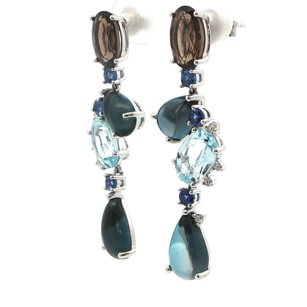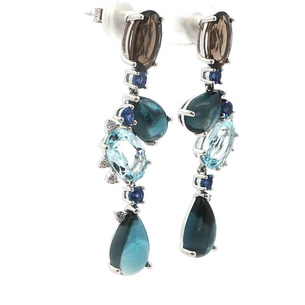 Moni's Diamond Fehérarany Gyémánt Fülbevaló összesen 0,10 ct gyémánttal és színes drágakövekkel Az ékszerben G színű, Vs tisztaságú, Briliáns csiszolású természetes gyémánt, Füstkvarc, Zafír, Topáz és London Blue topáz ragyog. A gyémántékszer mellé minőségi tanúsítványt adunk.