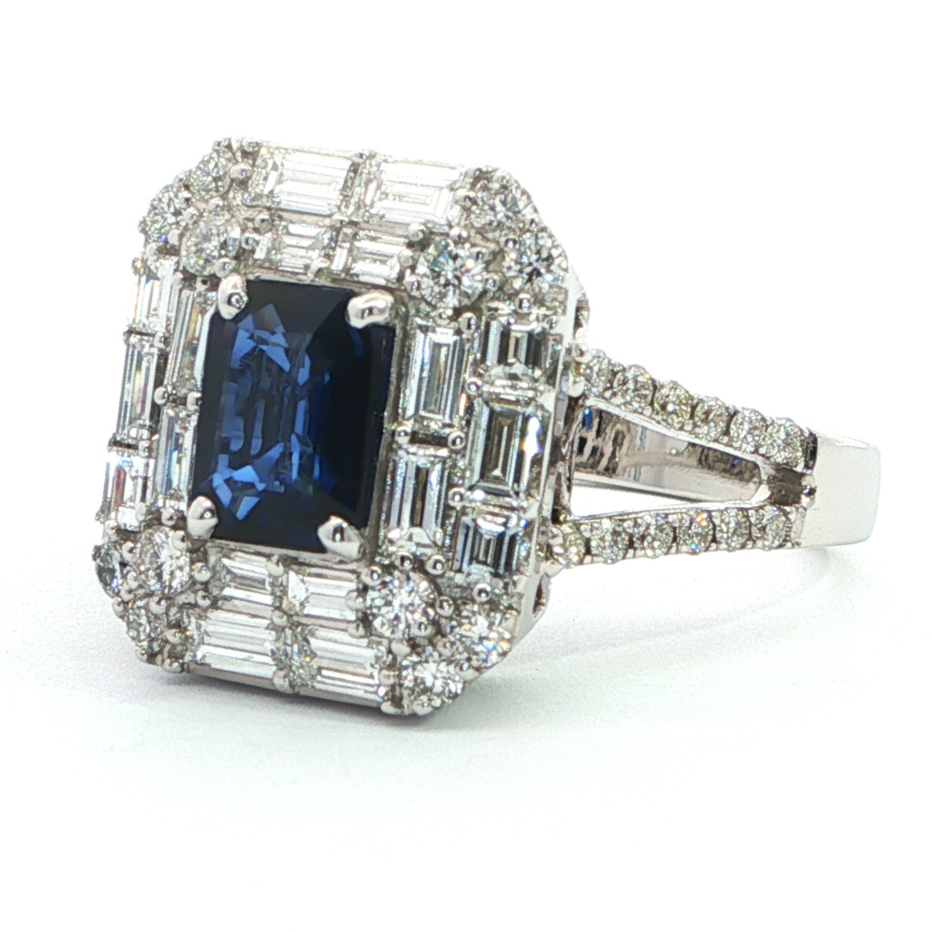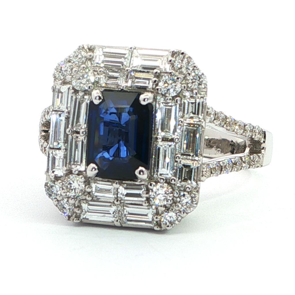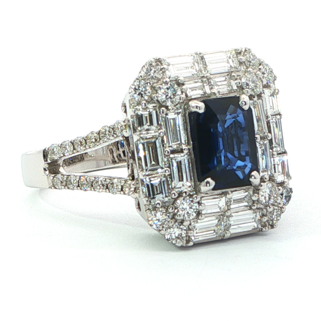 Moni's Diamond Fehérarany Zafír Gyűrű összesen 1.21 ct gyémánttal. Az ékszerben G színű, Vs tisztaságú, Baguette és Briliáns csiszolású természetes gyémánt és Zafír drágakő ragyog. A gyémántékszer mellé minőségi tanúsítványt adunk.