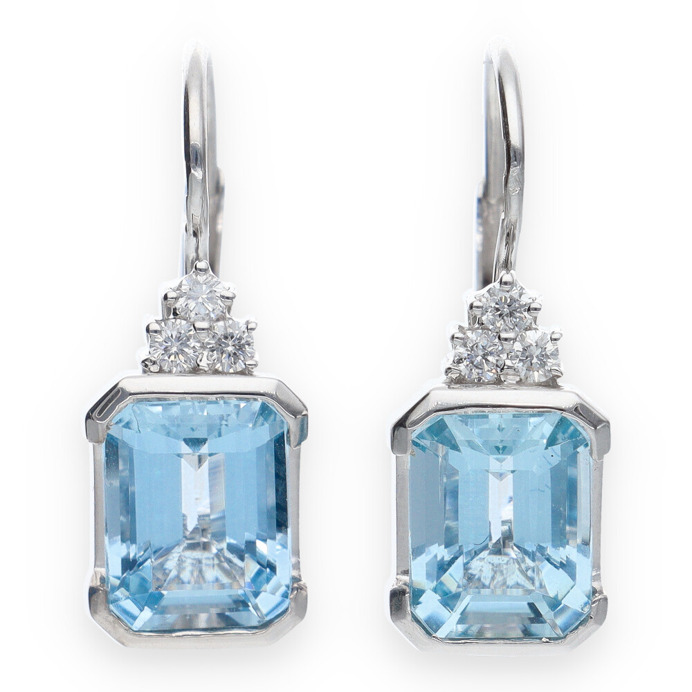 Moni's Diamond Fehérarany Akvamarin Fülbevaló összesen 0.18 ct gyémánttal. Az ékszerben VS tisztaságú, G színű, Briliáns csiszolású természetes gyémánt és Akvamarin drágakő ragyog. A gyémántékszer mellé minőségi tanúsítványt adunk.